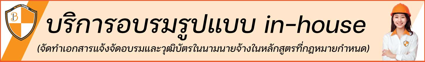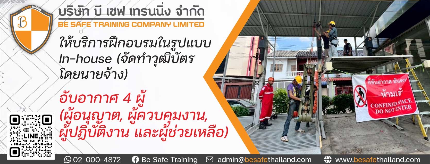 บริษัท บี เซฟ เทรนนิ่ง จำกัด ให้บริการจัดอบรมรูปแบบ In-house Training ตามมาตรฐานความปลอดภัย นำทีมวิทยากรผู้เชี่ยวชาญพร้อมอุปกรณ์ครบชุดมาจัดอบรมถึงสถานประกอบการของคุณ เรามีประสบการณ์จัดอบรมอับอากาศ 4 ผู้ (ผู้อนุญาต ผู้ควบคุมงาน ผู้ช่วยเหลือ และผู้ปฏิบัติงาน) อบรมปั้นจั่น 4 ผู้ (ผู้บังคับปั้นจั่น ผู้ให้สัญญาณ ผู้ยึดเกาะ และผู้ควบคุมการใช้) และอบรมเครน 4 ผู้ ที่ได้รับการรับรองจากกรมสวัสดิการและคุ้มครองแรงงาน เลขที่ใบรับรอง 13-67-098 ช่วยให้พนักงานของคุณได้รับความรู้ ทักษะ และความเข้าใจในการทำงานอย่างปลอดภัยตามที่กฎหมายกำหนด พร้อมออกใบรับรองที่ได้มาตรฐานและเป็นที่ยอมรับทั่วประเทศ